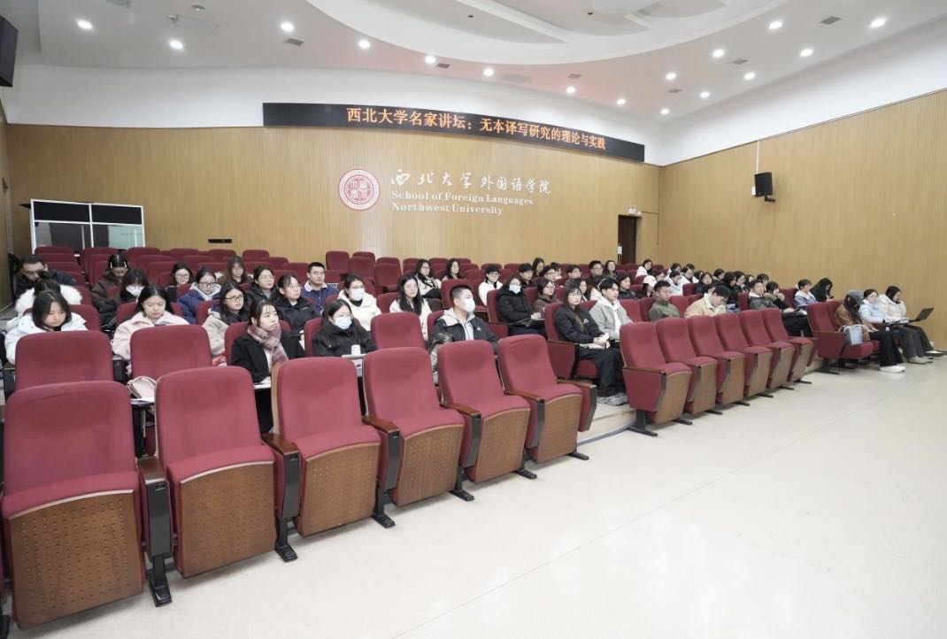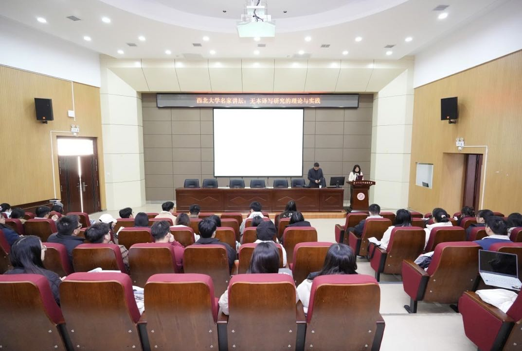 On the afternoon of November 25, 2025, Professor Liu Xiaofeng from Xi’an International Studies University was invited to the Northwest University Distinguished Lecture. He delivered a special lecture titled “Theory and Practice of Textless Trans-writing Research” for faculty and students. The lecture was hosted by Su Rui, Vice Dean of the Northwest University School of Foreign Languages. Numerous faculty and students from the university attended.
